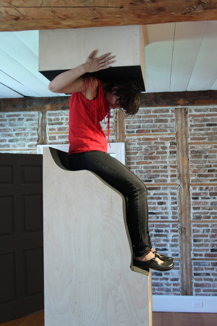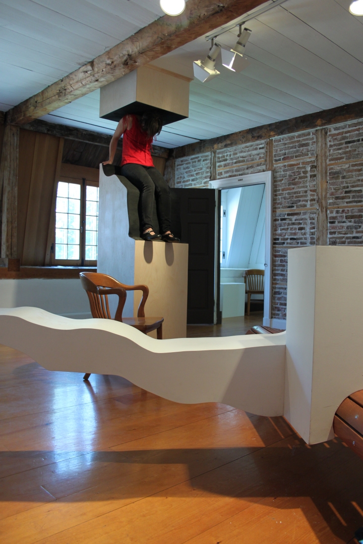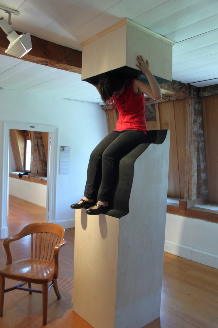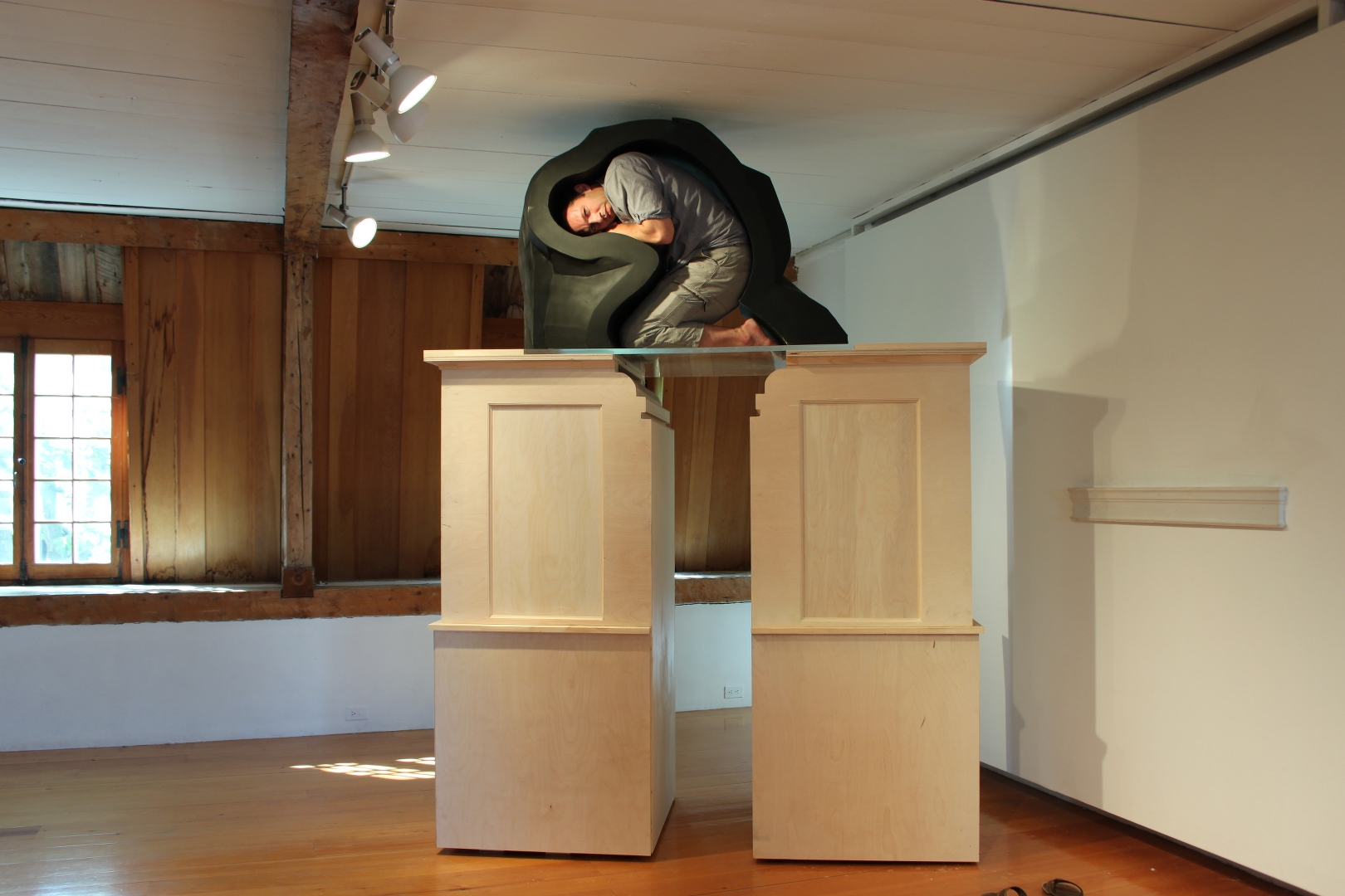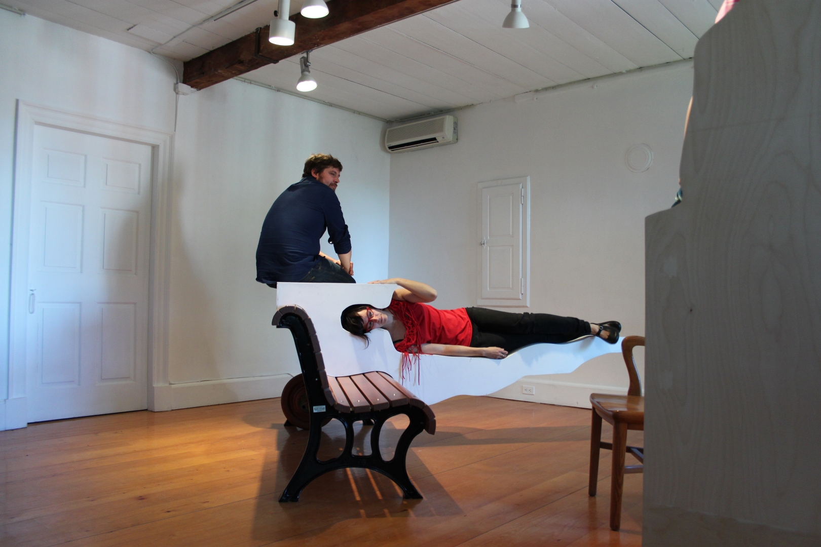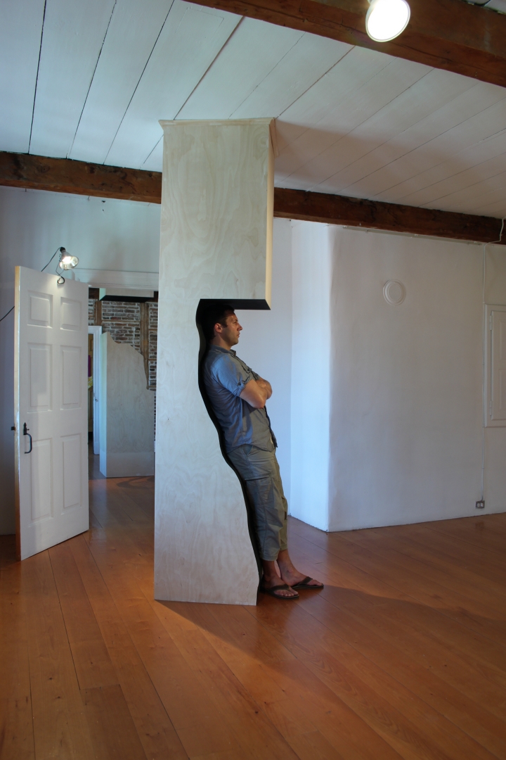 Les sculptures conçues pour cette exposition servent essentiellement de support à une série d’actions et de performances. Comme l’idée est de fusionner les notions de regardeur et d’objet, elles représentent ce qui est exposé et sont aussi construites de manière à épouser parfaitement le corps d’un visiteur fictif. Le corps de chaque performeur correspond donc à deux formes disposées dans l’espace et, lors du vernissage ainsi qu’à quelques reprises au cours de l’exposition, ceux-ci passent de l’une à l’autre. Lorsqu’un performeur se trouve dans une des formes qui lui correspond, il contemple son absence dans l’autre. Entre-temps, il redevient un visiteur comme les autres et déambule dans l’espace. (Voir la vidéo)