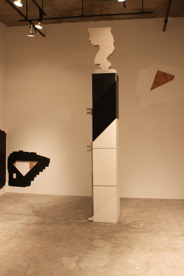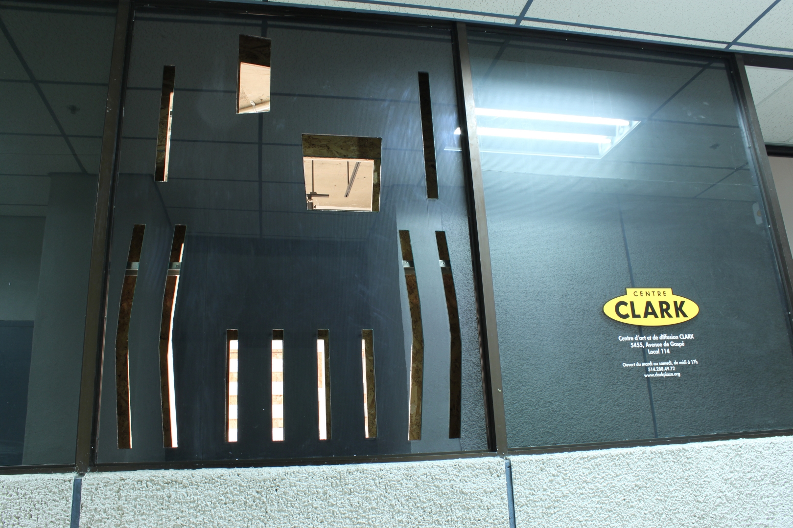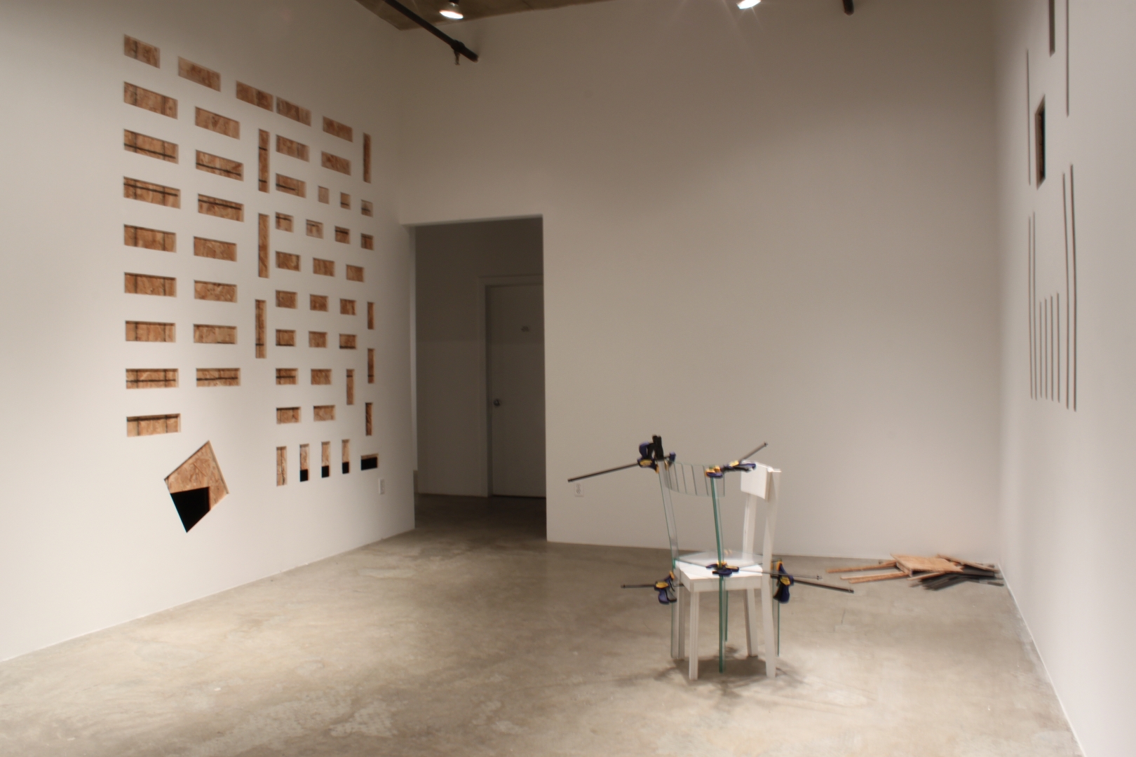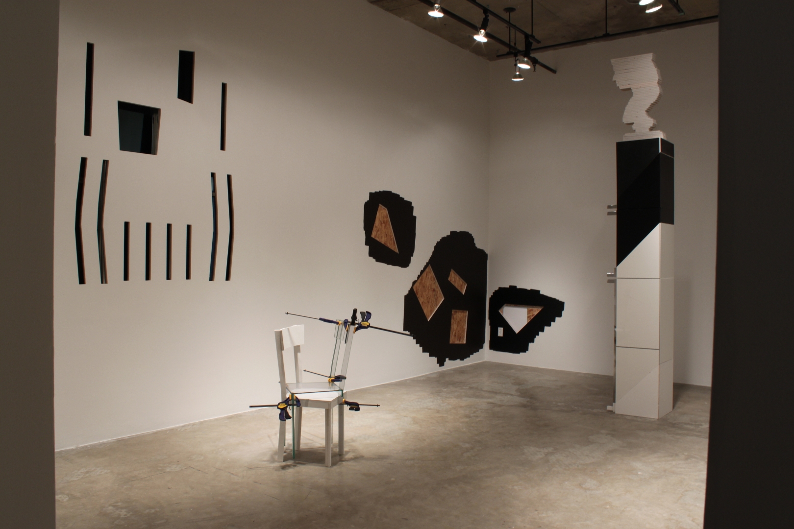 Des fragments de matière prélevés directement sur les murs du Centre Clark servent à concevoir les sculptures présentées dans cette exposition. Tantôt issues d’un meuble découpé puis reconstitué à l’aide de ces matériaux de fortune extirpés des parois, tantôt créées uniquement à partir de ce qui provient du lieu lui-même, les pièces intègrent toutes une portion de l’espace dans leur structure. Ainsi, les découpes visibles sur les murs correspondent aux formes des objets disposés dans l’espace, et l’ensemble entre dans une mécanique visuelle où la frontière entre l’architecture et son contenu devient poreuse.