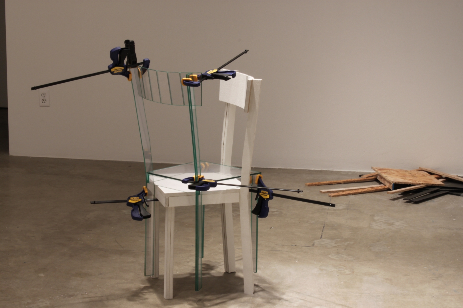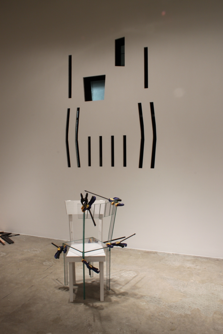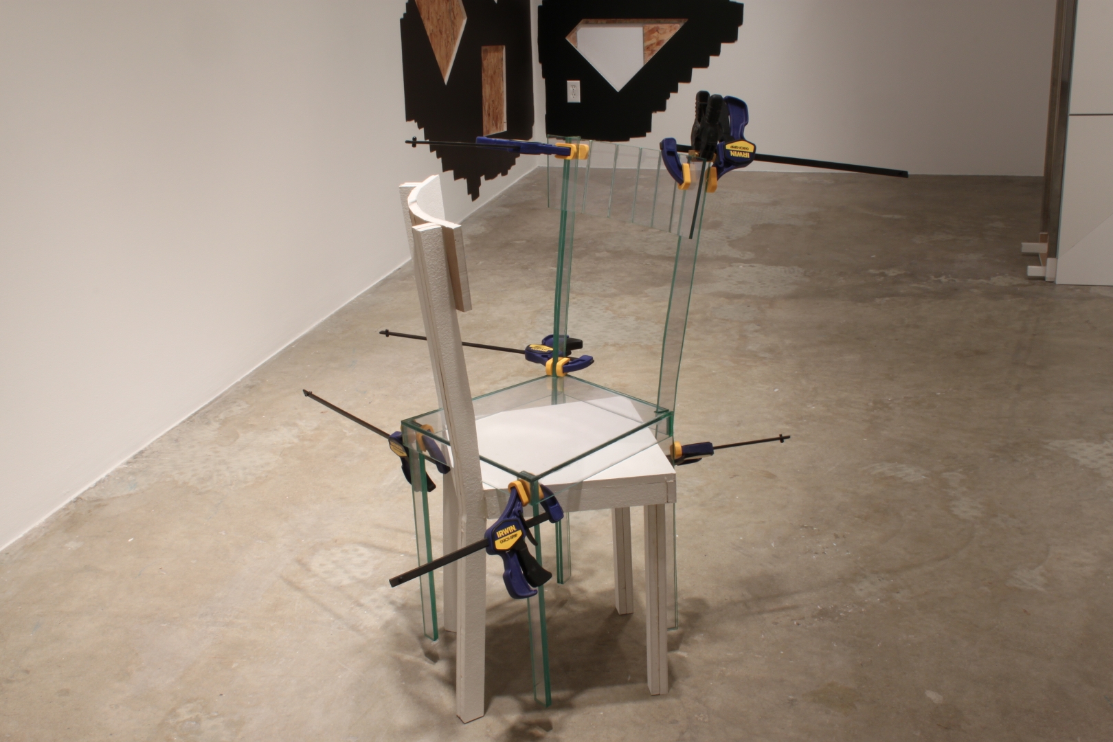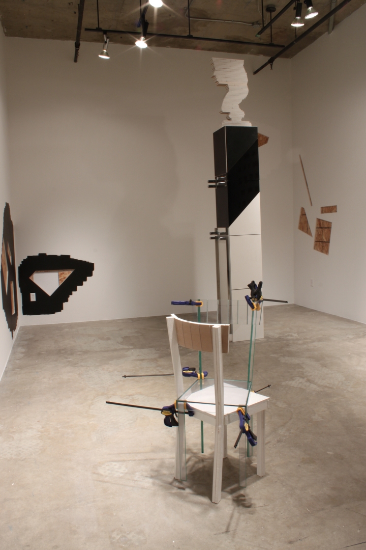 Des fragments de matière prélevés directement sur les murs du Centre Clark servent à concevoir les sculptures présentées dans cette exposition. Tantôt issues d’un meuble découpé puis reconstitué à l’aide de ces matériaux de fortune extirpés des parois, tantôt créées uniquement à partir de ce qui provient du lieu lui-même, les pièces intègrent toutes une portion de l’espace dans leur structure. Ainsi, les découpes visibles sur les murs correspondent aux formes des objets disposés dans l’espace, et l’ensemble entre dans une mécanique visuelle où la frontière entre l’architecture et son contenu devient poreuse.