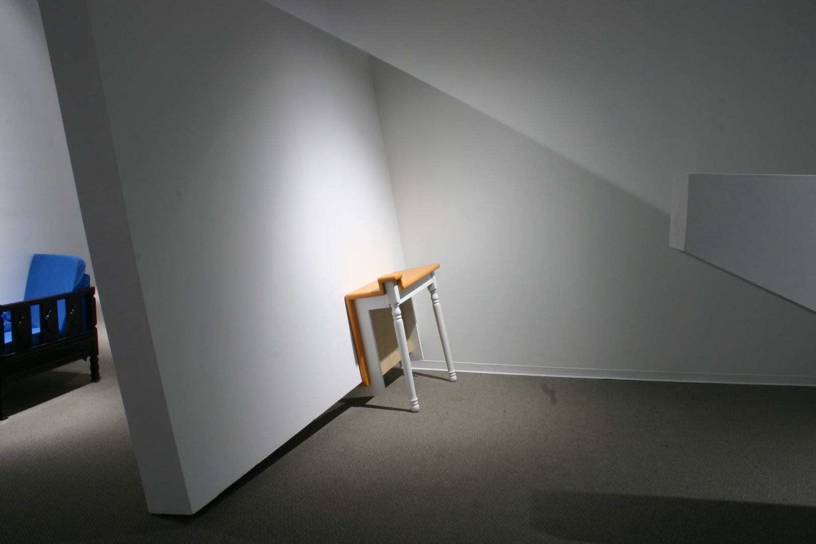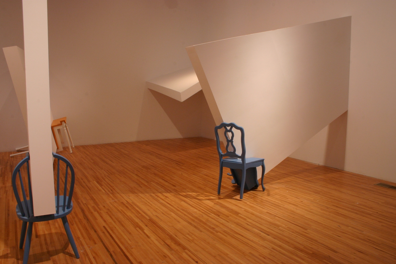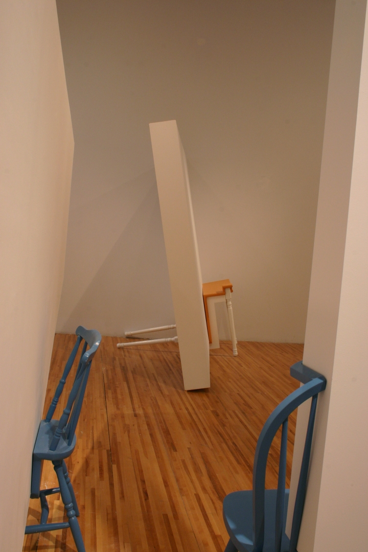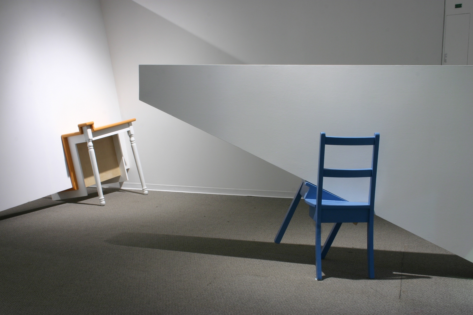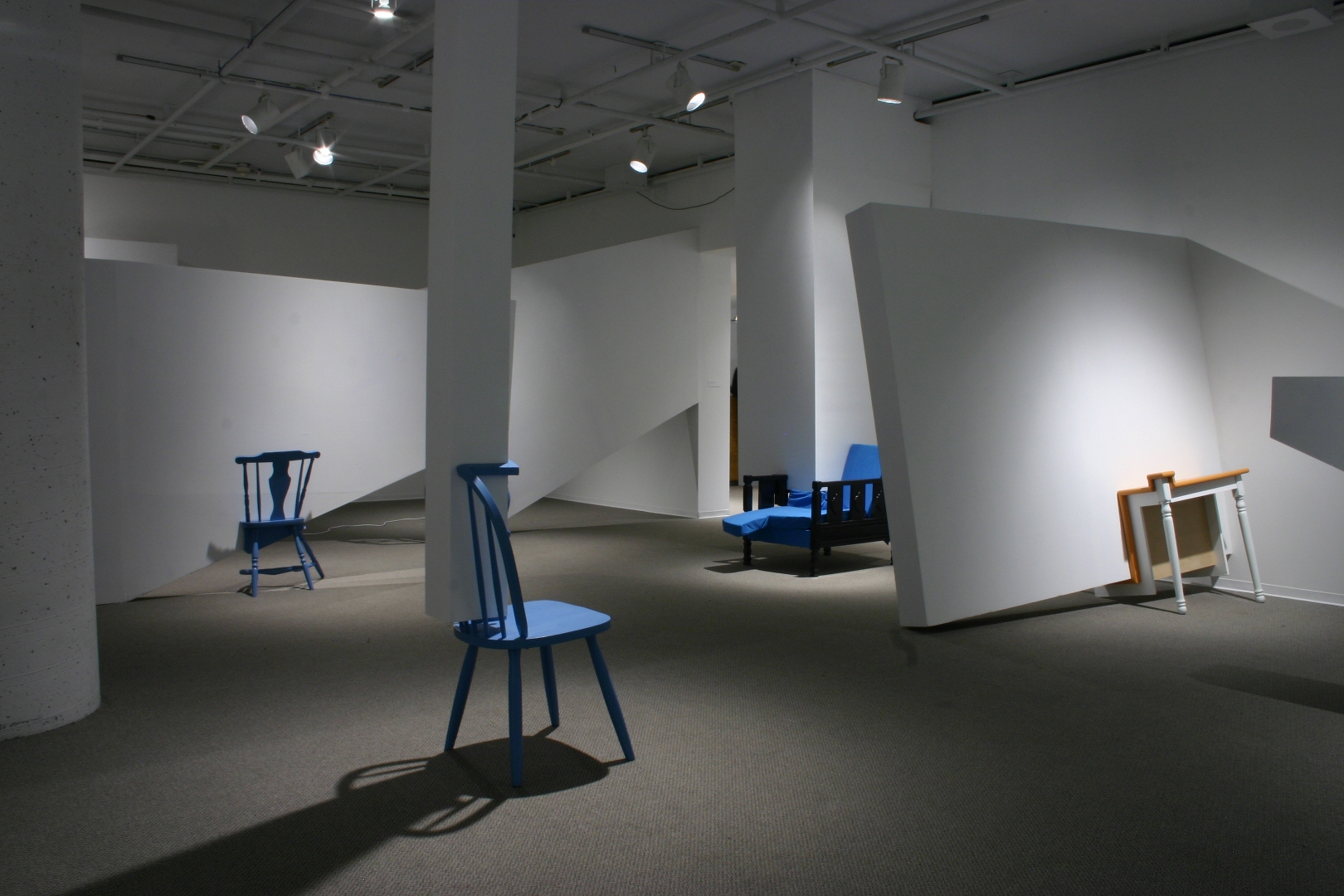 Quelques modules géométriques blancs sont installés sur les murs et le plafond d’une galerie afin d’en transformer l’architecture. Cette intervention envahit littéralement l’espace d’exposition, ce qui rend l’environnement complètement incompatible avec la disposition d’objets. Le mobilier destiné à y prendre place doit donc être modifié avant d’être inséré dans l’espace ; la forme de chaque meuble devient proportionnelle aux nouvelles contraintes architecturales, ce qui, par le fait même, lie l’espace et les objets.