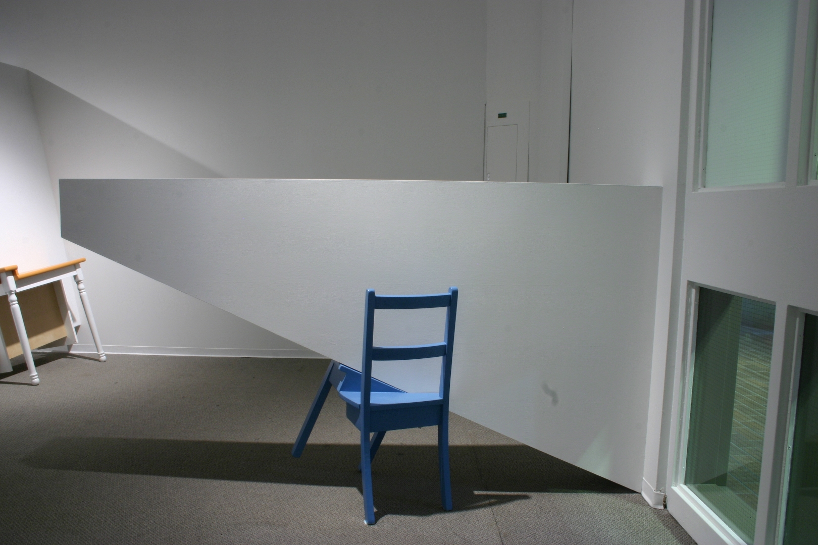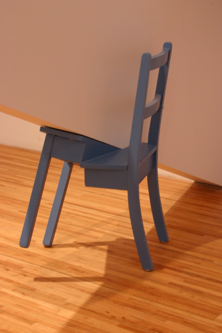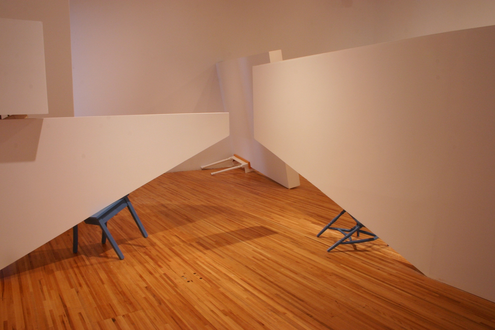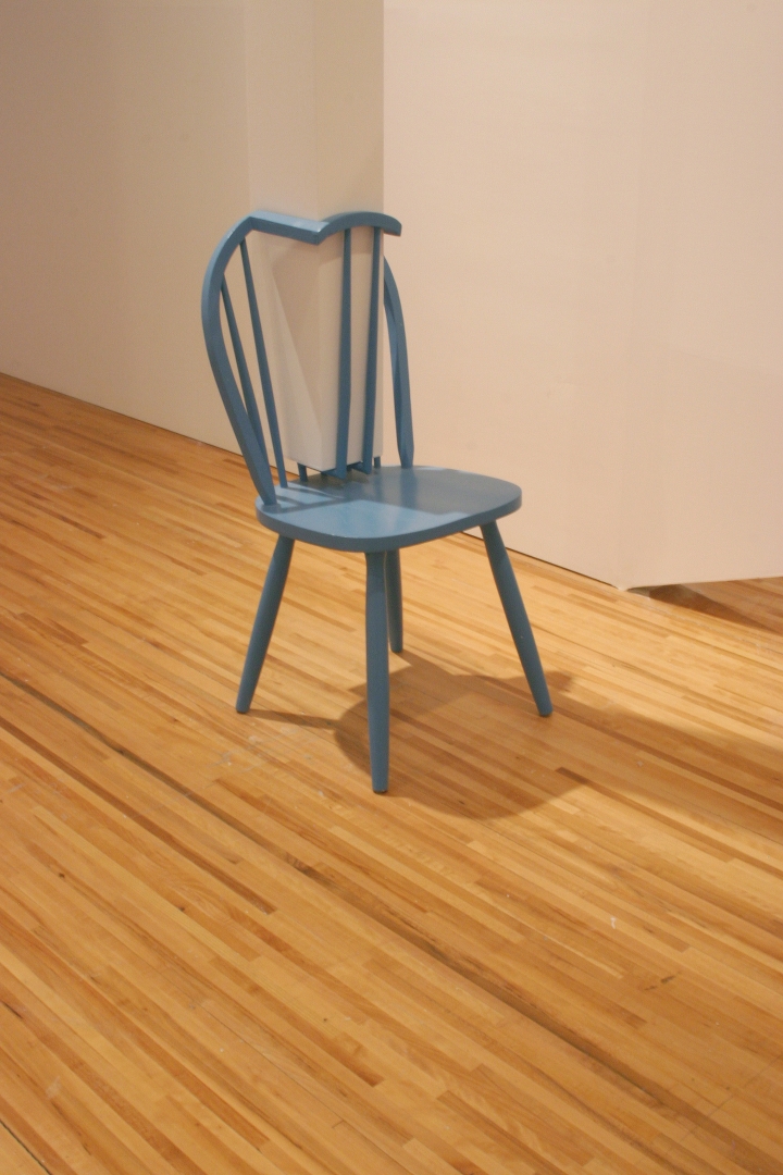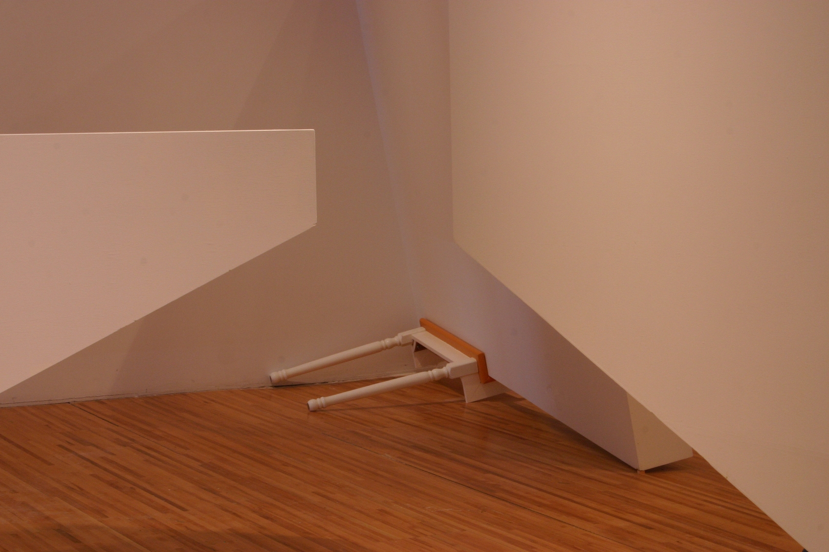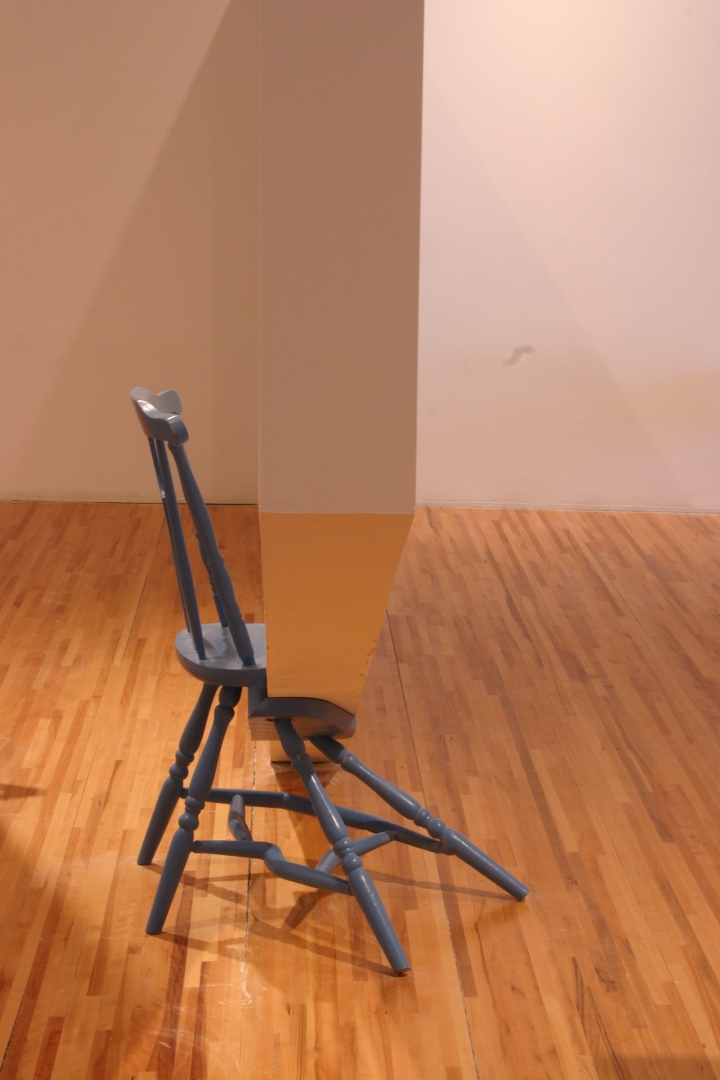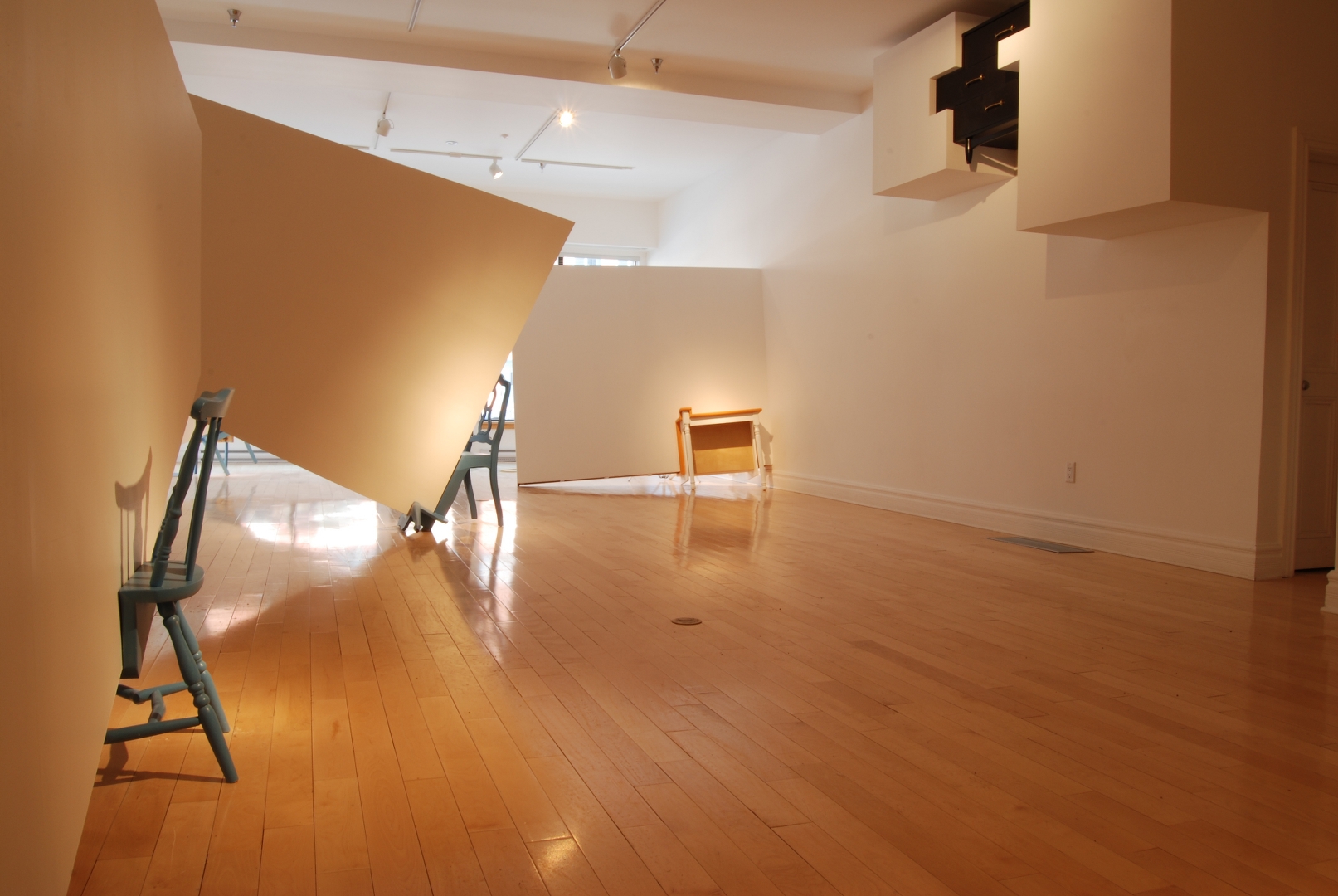 Quelques modules géométriques blancs sont installés sur les murs et le plafond d’une galerie afin d’en transformer l’architecture. Cette intervention envahit littéralement l’espace d’exposition, ce qui rend l’environnement complètement incompatible avec la disposition d’objets. Le mobilier destiné à y prendre place doit donc être modifié avant d’être inséré dans l’espace ; la forme de chaque meuble devient proportionnelle aux nouvelles contraintes architecturales, ce qui, par le fait même, lie l’espace et les objets.