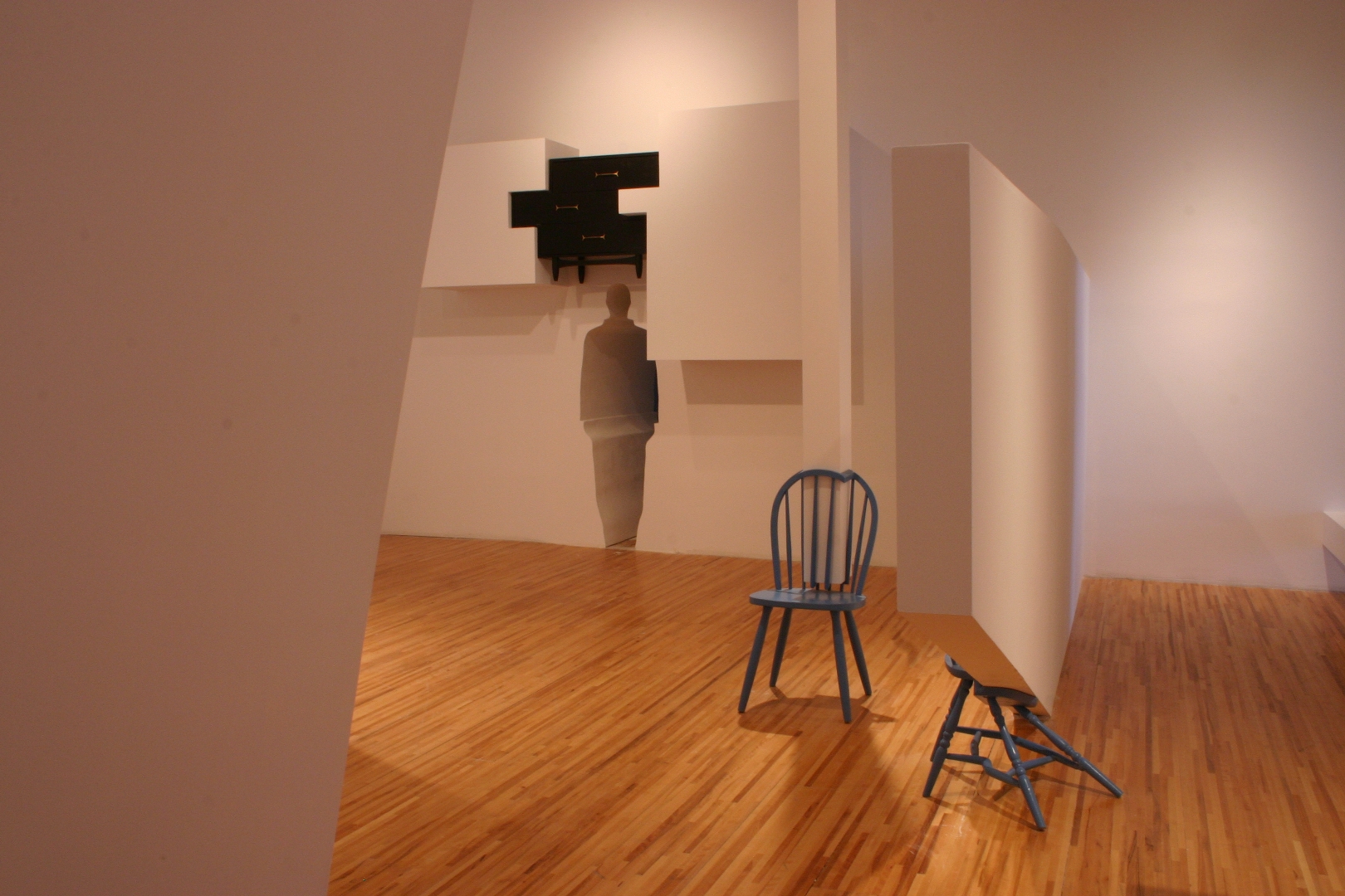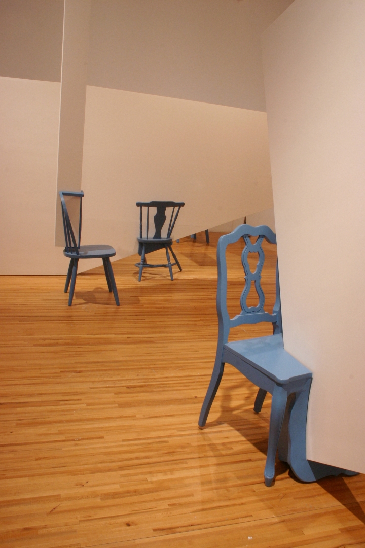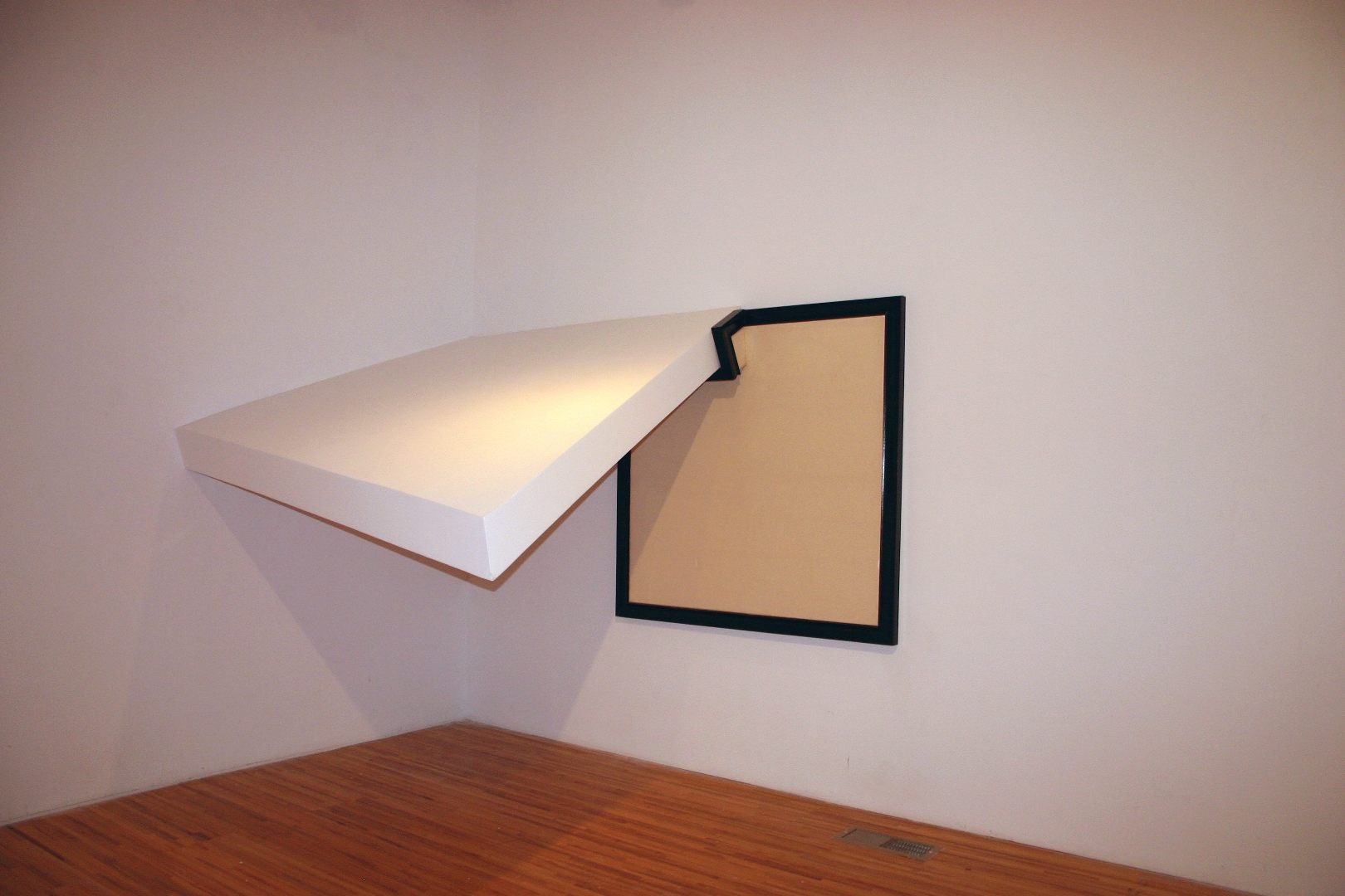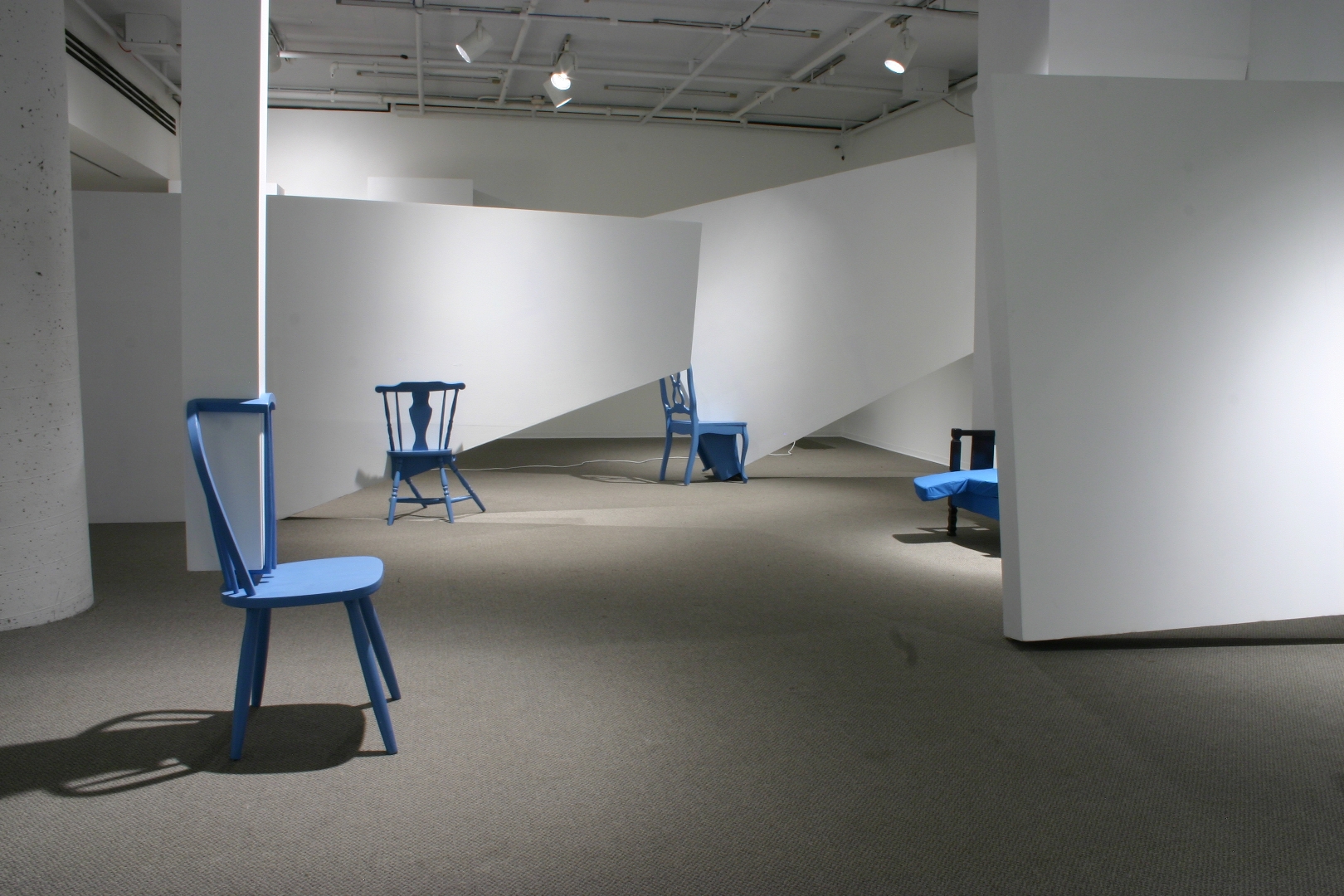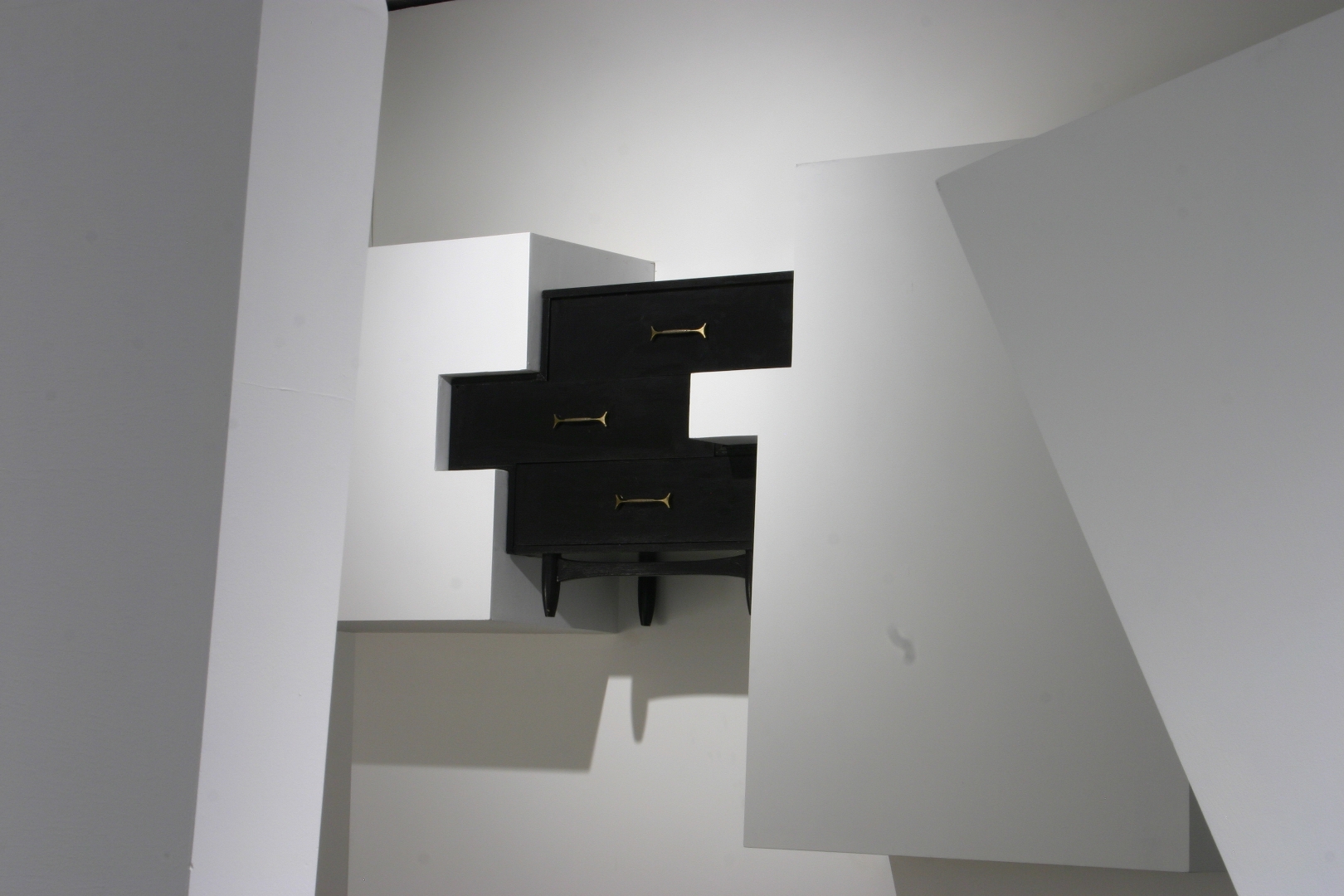 Quelques modules géométriques blancs sont installés sur les murs et le plafond d’une galerie afin d’en transformer l’architecture. Cette intervention envahit littéralement l’espace d’exposition, ce qui rend l’environnement complètement incompatible avec la disposition d’objets. Le mobilier destiné à y prendre place doit donc être modifié avant d’être inséré dans l’espace ; la forme de chaque meuble devient proportionnelle aux nouvelles contraintes architecturales, ce qui, par le fait même, lie l’espace et les objets.