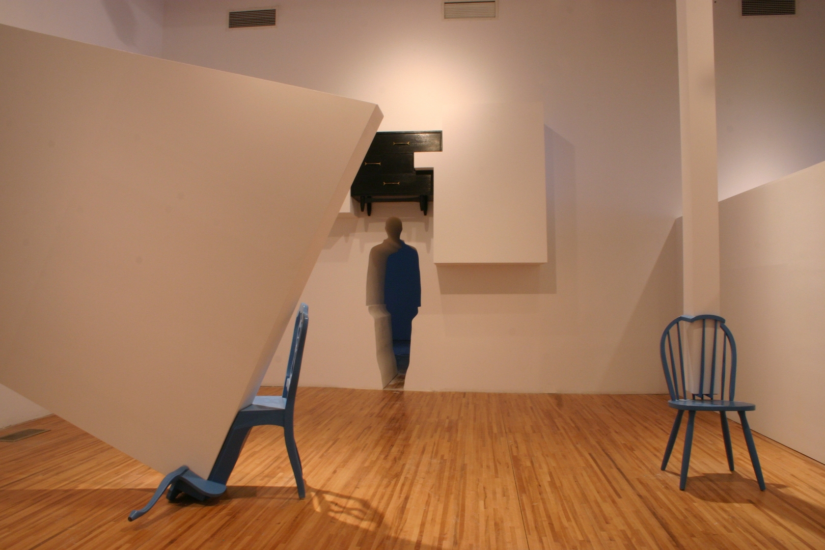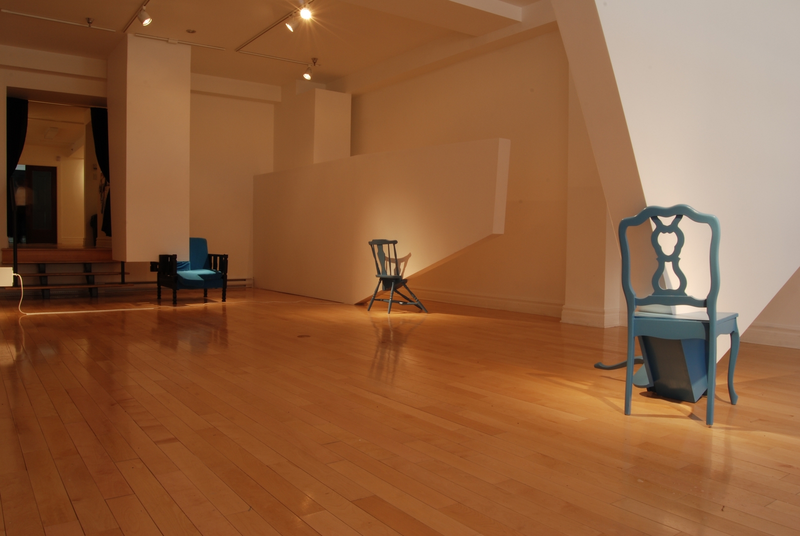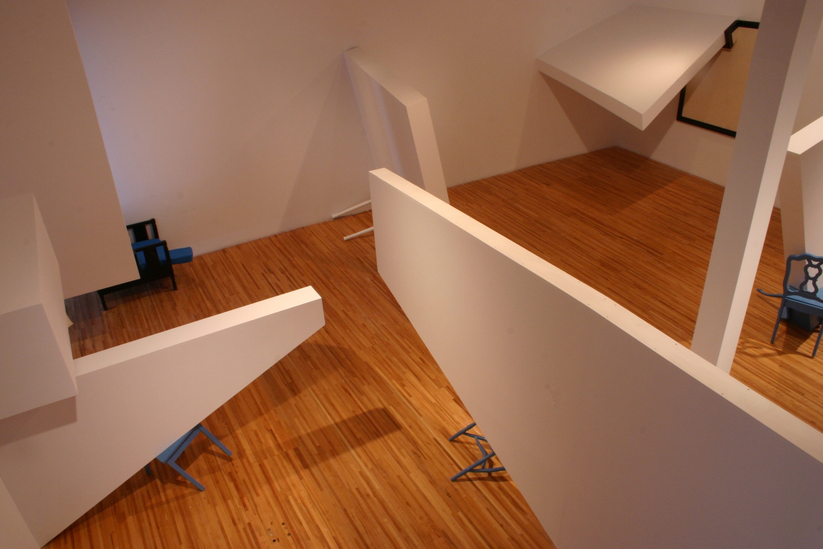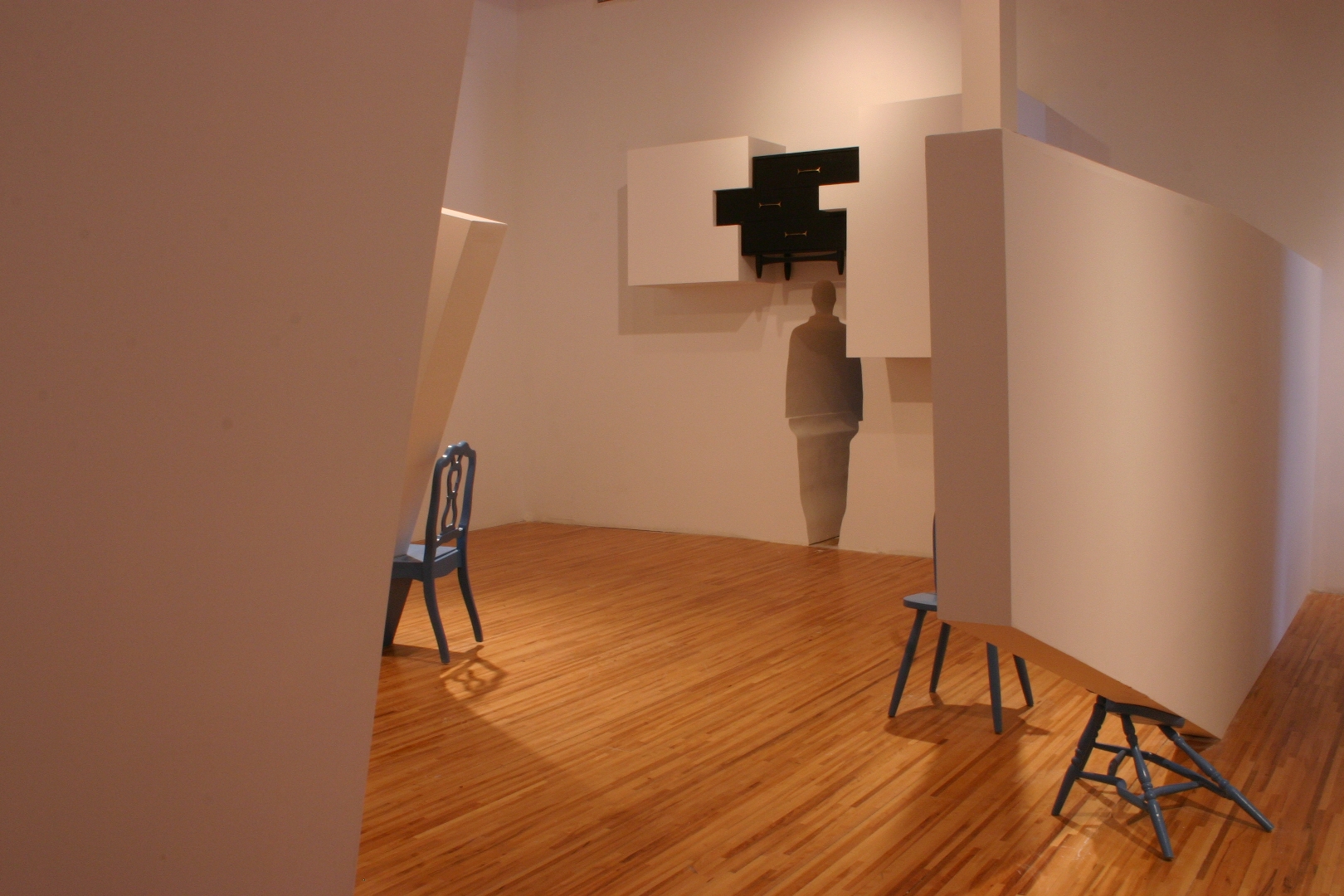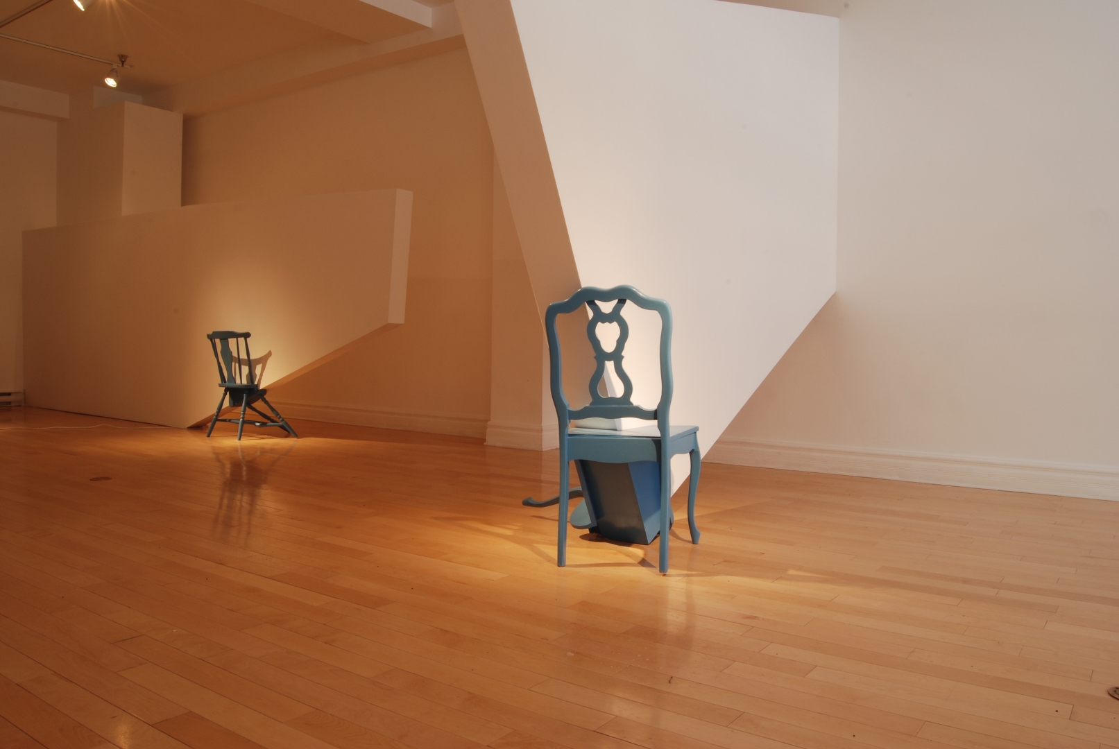 Quelques modules géométriques blancs sont installés sur les murs et le plafond d’une galerie afin d’en transformer l’architecture. Cette intervention envahit littéralement l’espace d’exposition, ce qui rend l’environnement complètement incompatible avec la disposition d’objets. Le mobilier destiné à y prendre place doit donc être modifié avant d’être inséré dans l’espace ; la forme de chaque meuble devient proportionnelle aux nouvelles contraintes architecturales, ce qui, par le fait même, lie l’espace et les objets.