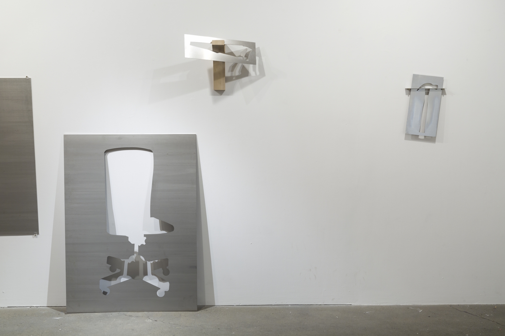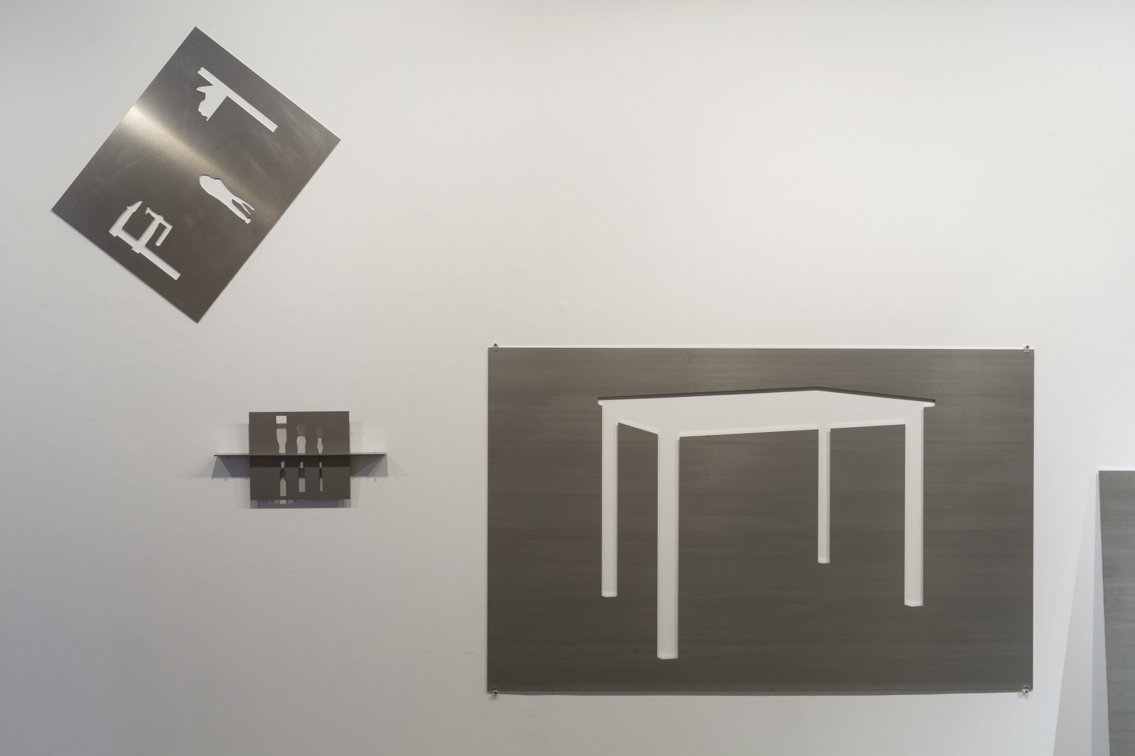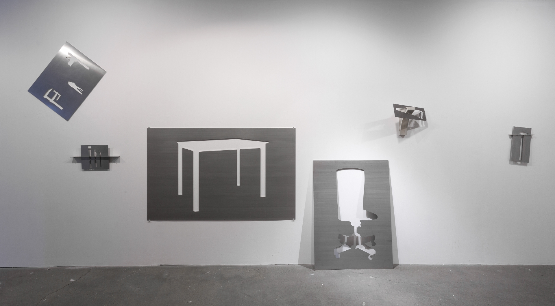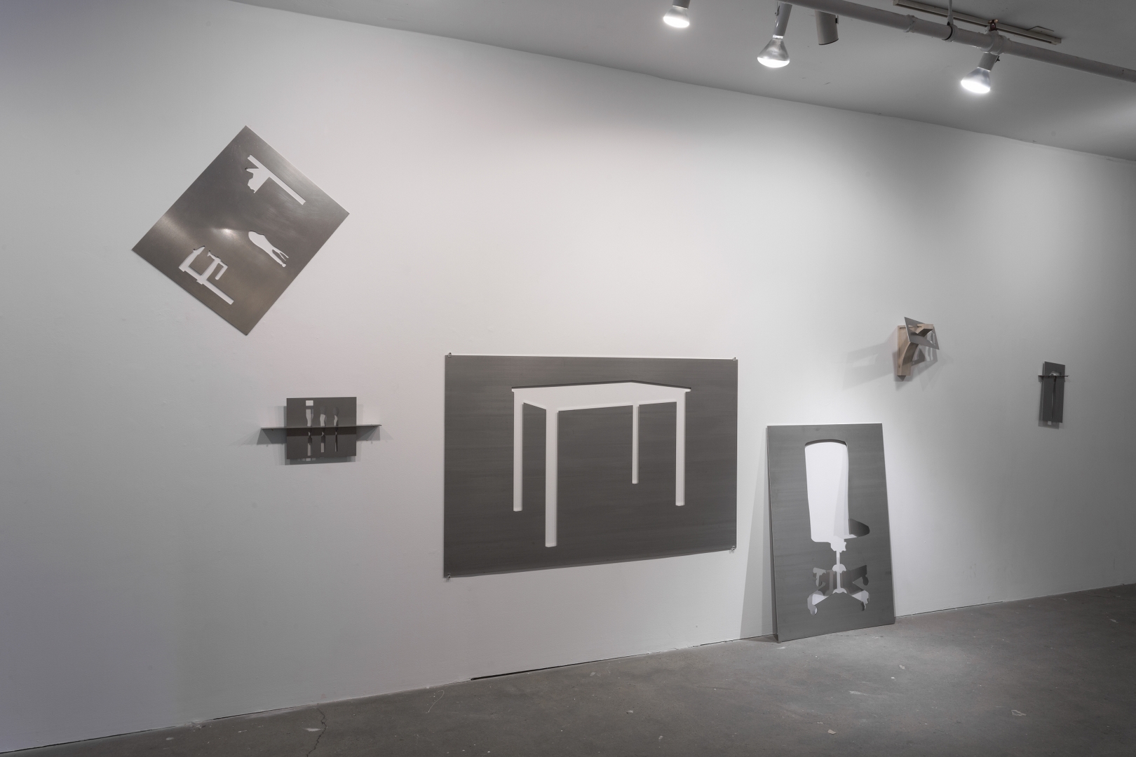 Cette installation consiste à dénuder la galerie de presque toute sa surface de gypse pour n’en laisser qu’une petite partie. Comme il ne reste plus qu’un seul emplacement pour la présentation des cinq tableaux qui auraient formé l’exposition, ceux-ci sont regroupés dans l’espace qui reste et deviennent un seul et unique objet. Dans la salle adjacente, le même principe de contraction de l’espace s’opère par la superposition de deux présentoirs dans un même lieu. Puis, face à ce dispositif, une série de silhouettes d’objets utilitaires tels que scie, chaise, table, etc., est découpée dans des plaques d’acier inoxydable, comme si ces objets étaient contraints d’exister dans un espace résiduel et aplati.