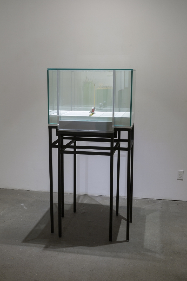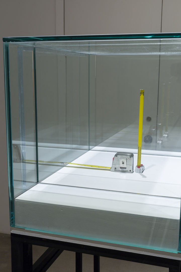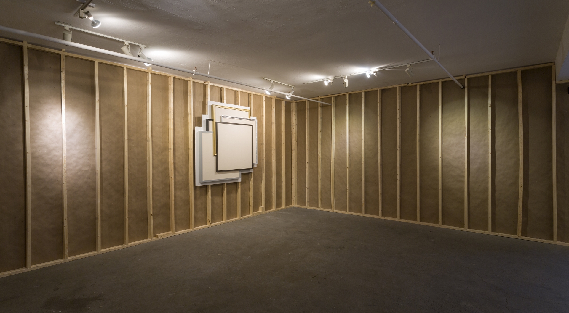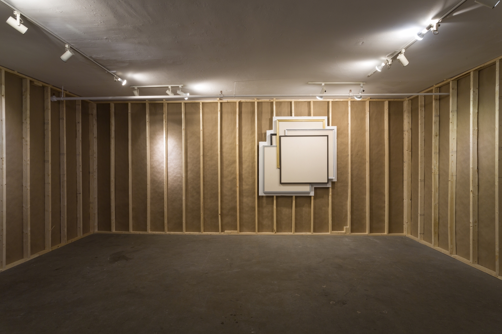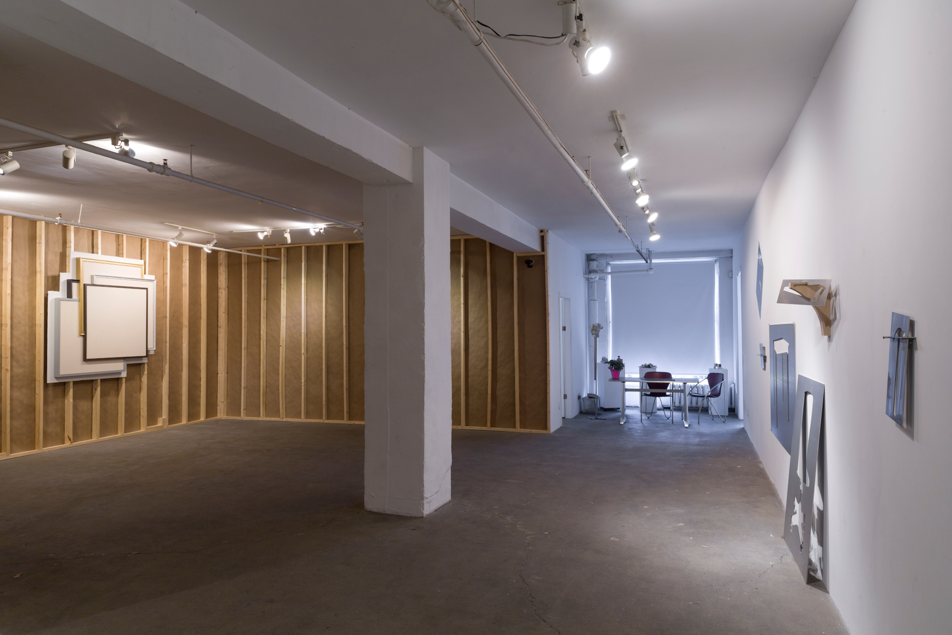 Cette installation consiste à dénuder la galerie de presque toute sa surface de gypse pour n’en laisser qu’une petite partie. Comme il ne reste plus qu’un seul emplacement pour la présentation des cinq tableaux qui auraient formé l’exposition, ceux-ci sont regroupés dans l’espace qui reste et deviennent un seul et unique objet. Dans la salle adjacente, le même principe de contraction de l’espace s’opère par la superposition de deux présentoirs dans un même lieu. Puis, face à ce dispositif, une série de silhouettes d’objets utilitaires tels que scie, chaise, table, etc., est découpée dans des plaques d’acier inoxydable, comme si ces objets étaient contraints d’exister dans un espace résiduel et aplati.