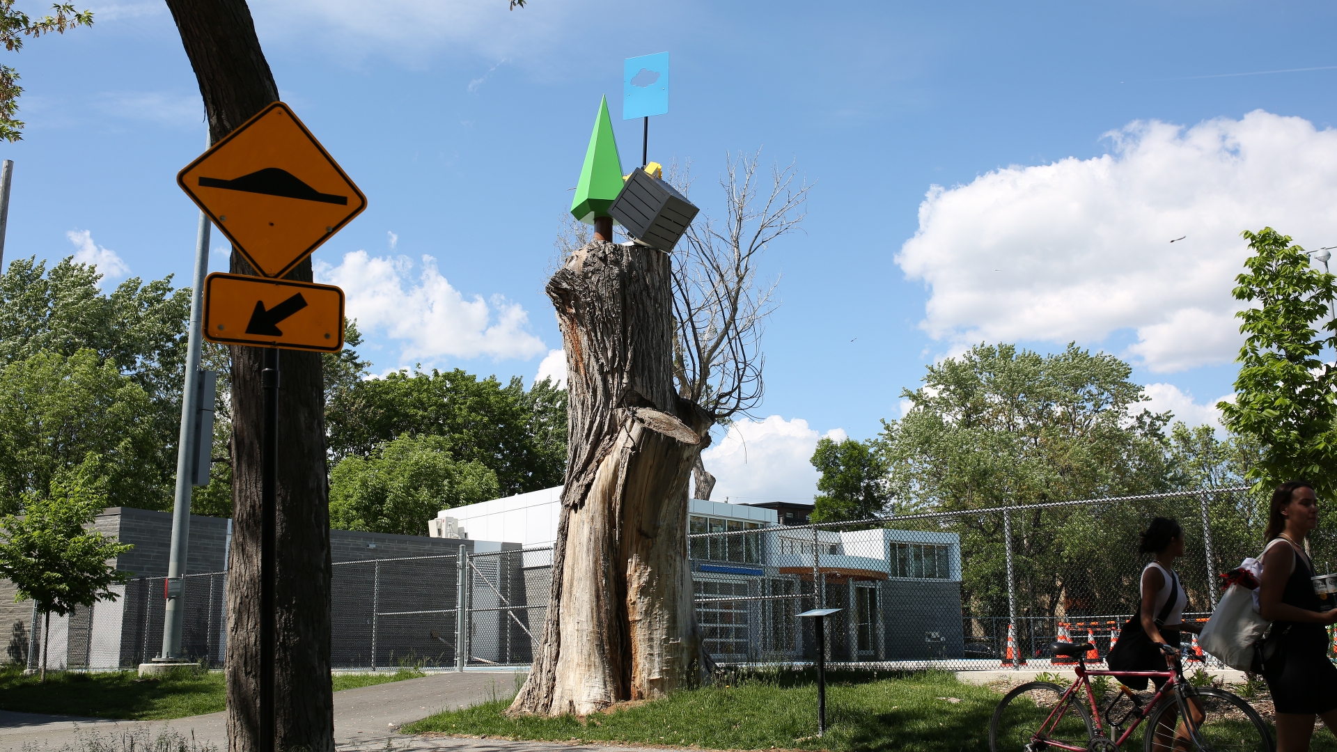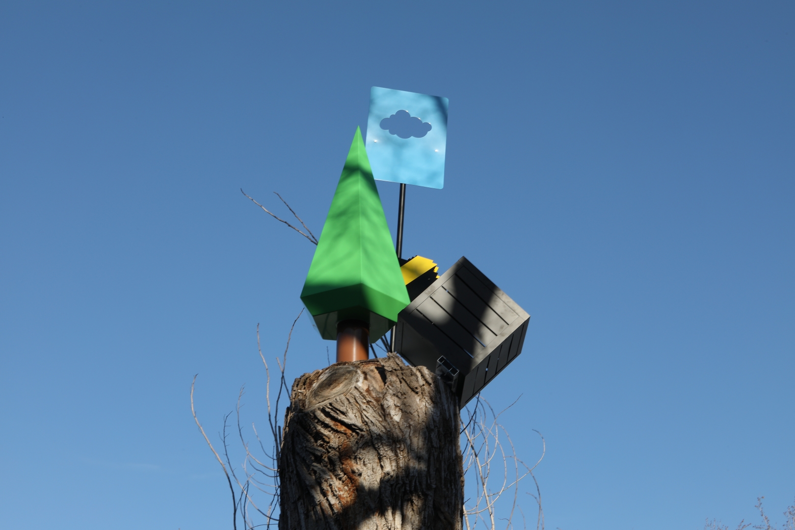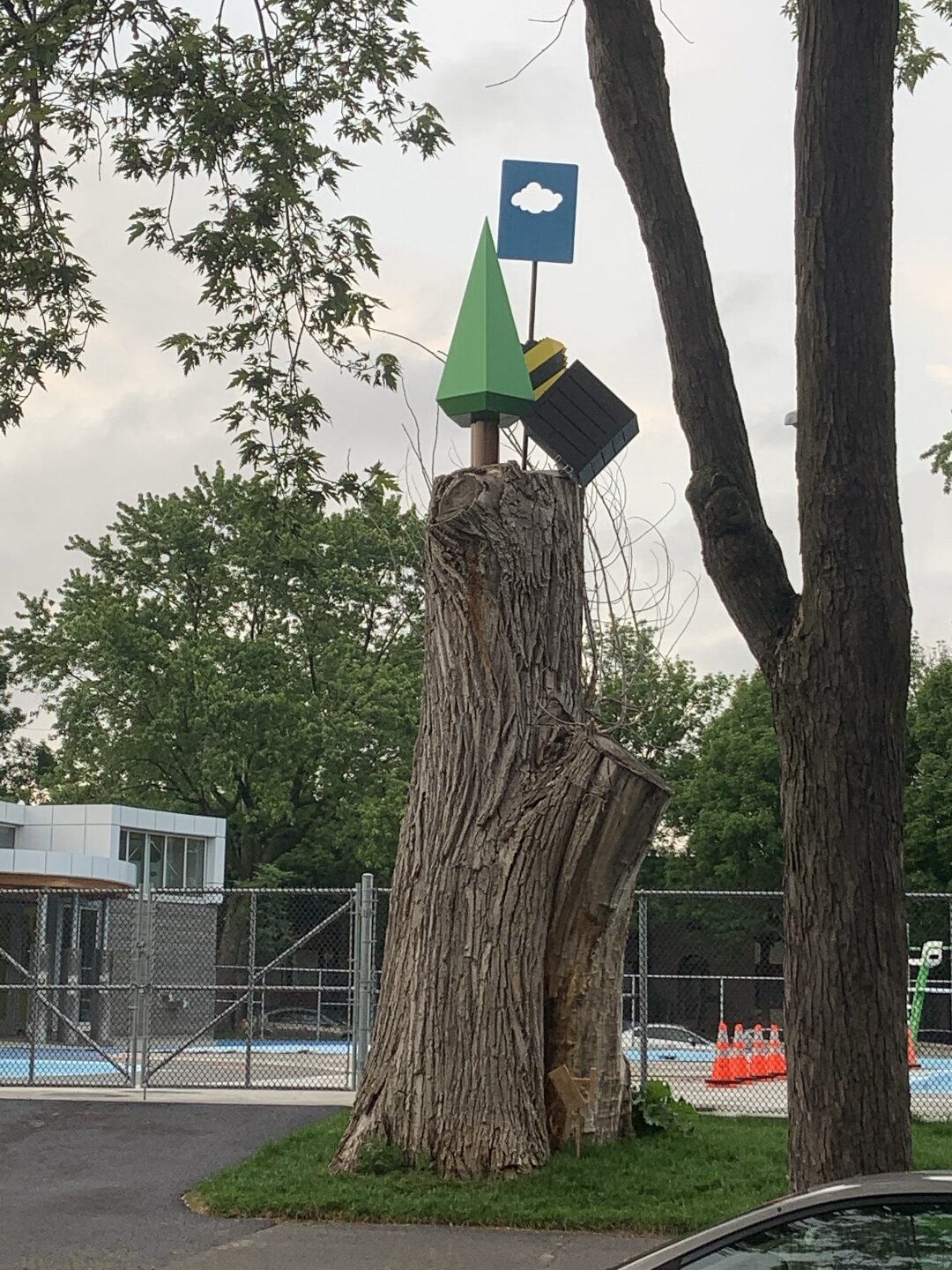 Cette œuvre prend place dans un parc et imite des éléments qui l’entourent : arbres, buissons taillés, panneaux de signalisation, le ciel, etc. D’une certaine façon, elle s’intègre à deux environnements diamétralement opposés : la ville, par sa situation géographique, mais aussi la nature, puisqu’elle est située dans un îlot de verdure au milieu du bâti. Par sa mise en espace et la schématisation des formes auxquelles elle se réfère, elle vise à porter un regard différent et ludique sur les éléments du paysage que nous côtoyons au quotidien.