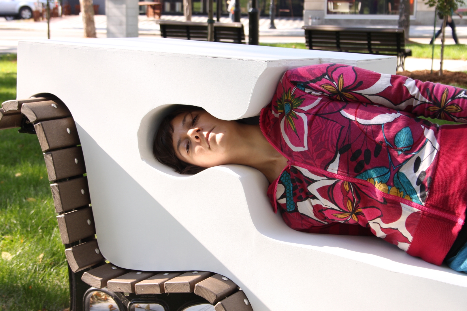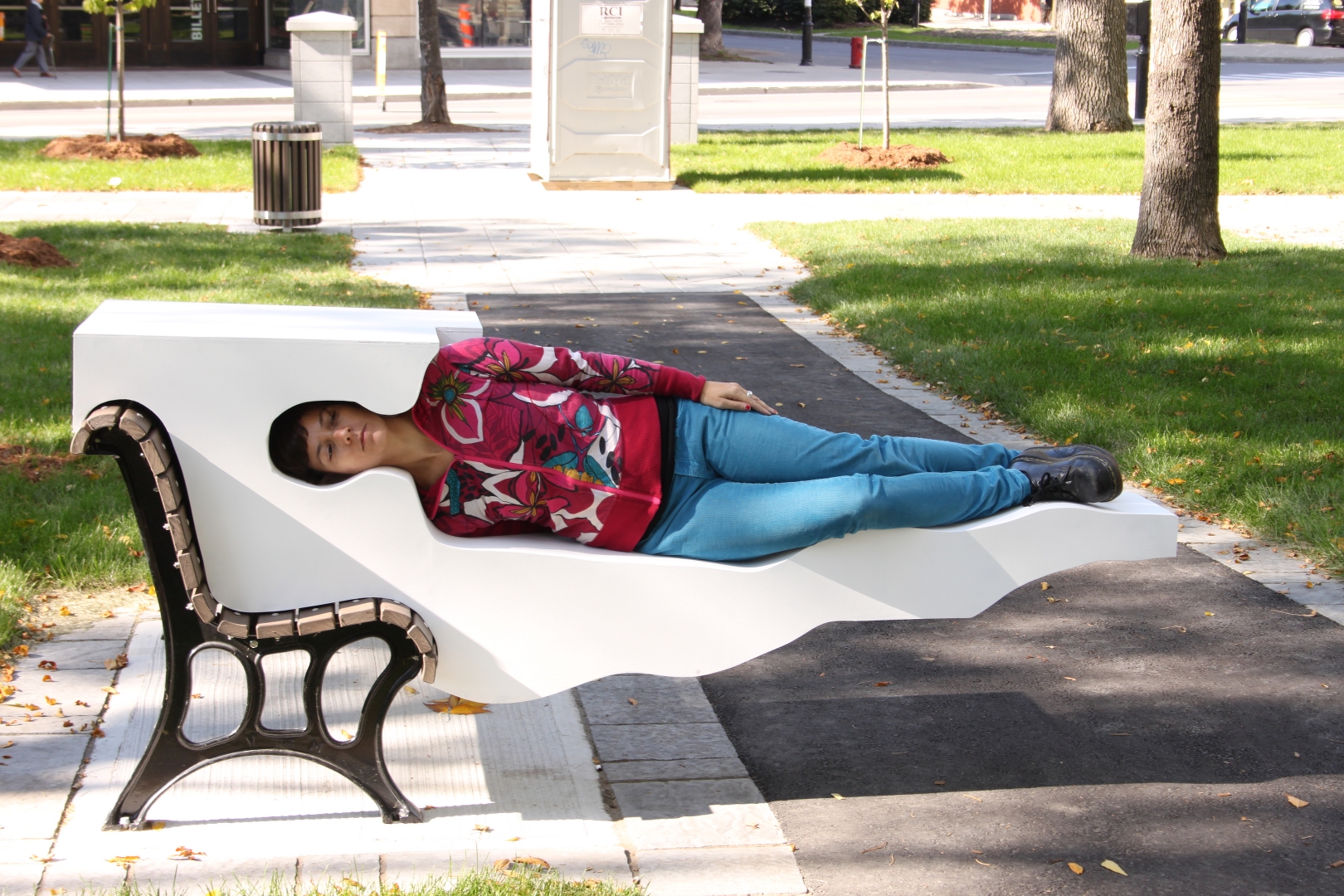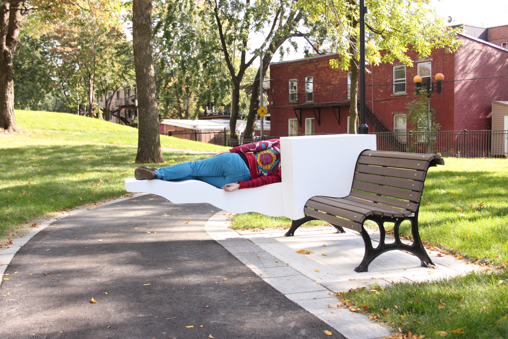 Dans cette œuvre, l’objectif est de créer une forme qui affecte la logique du positionnement habituel des choses en s’incrustant entre un objet et un corps humain. Dans ce cas, l’espace entre un banc et la personne qui y prend place est matérialisé de manière à positionner le corps en porte-à-faux par rapport à l’assise. L’ensemble s’imbrique ensuite pour défier la gravité et mettre en scène cette situation improbable.