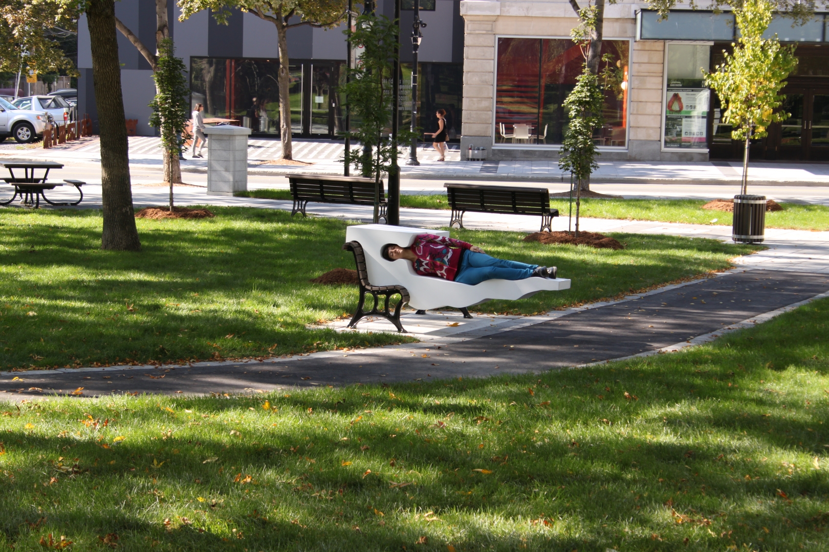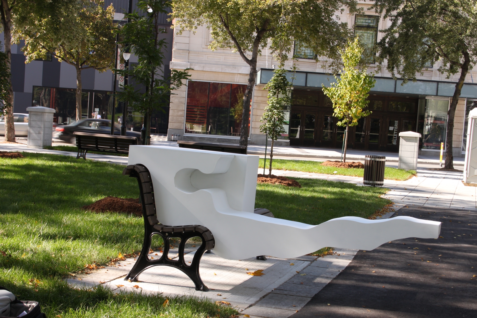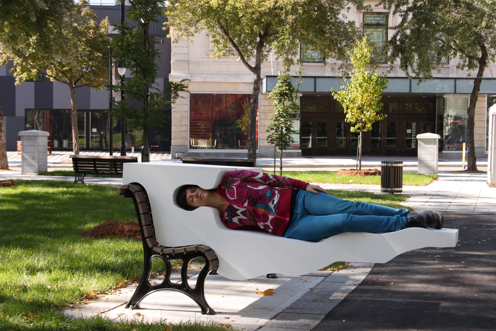 Dans cette œuvre, l’objectif est de créer une forme qui affecte la logique du positionnement habituel des choses en s’incrustant entre un objet et un corps humain. Dans ce cas, l’espace entre un banc et la personne qui y prend place est matérialisé de manière à positionner le corps en porte-à-faux par rapport à l’assise. L’ensemble s’imbrique ensuite pour défier la gravité et mettre en scène cette situation improbable.